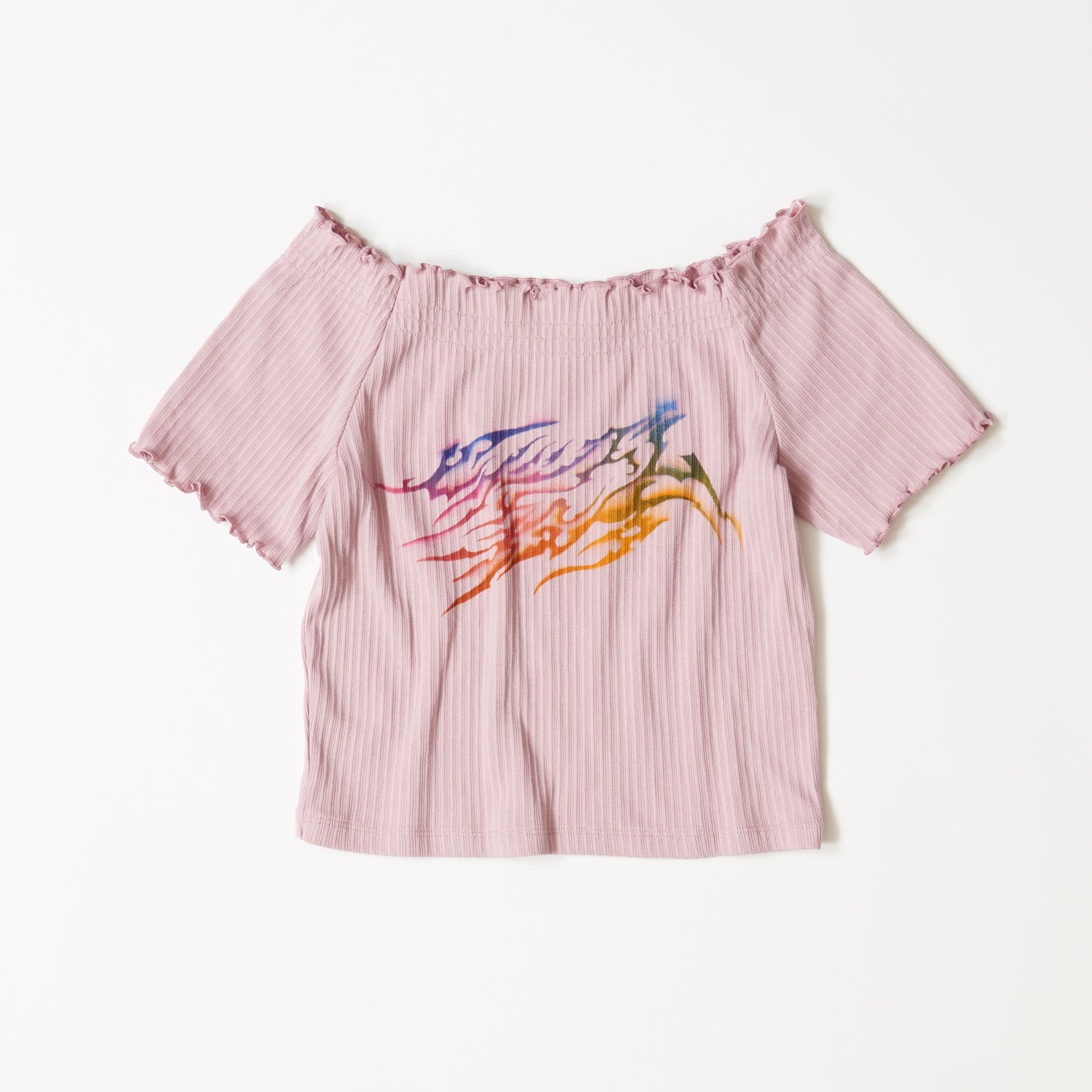 Off-shoulder ribbed T-shirt (dull pink/rainbow) | Kill sexism